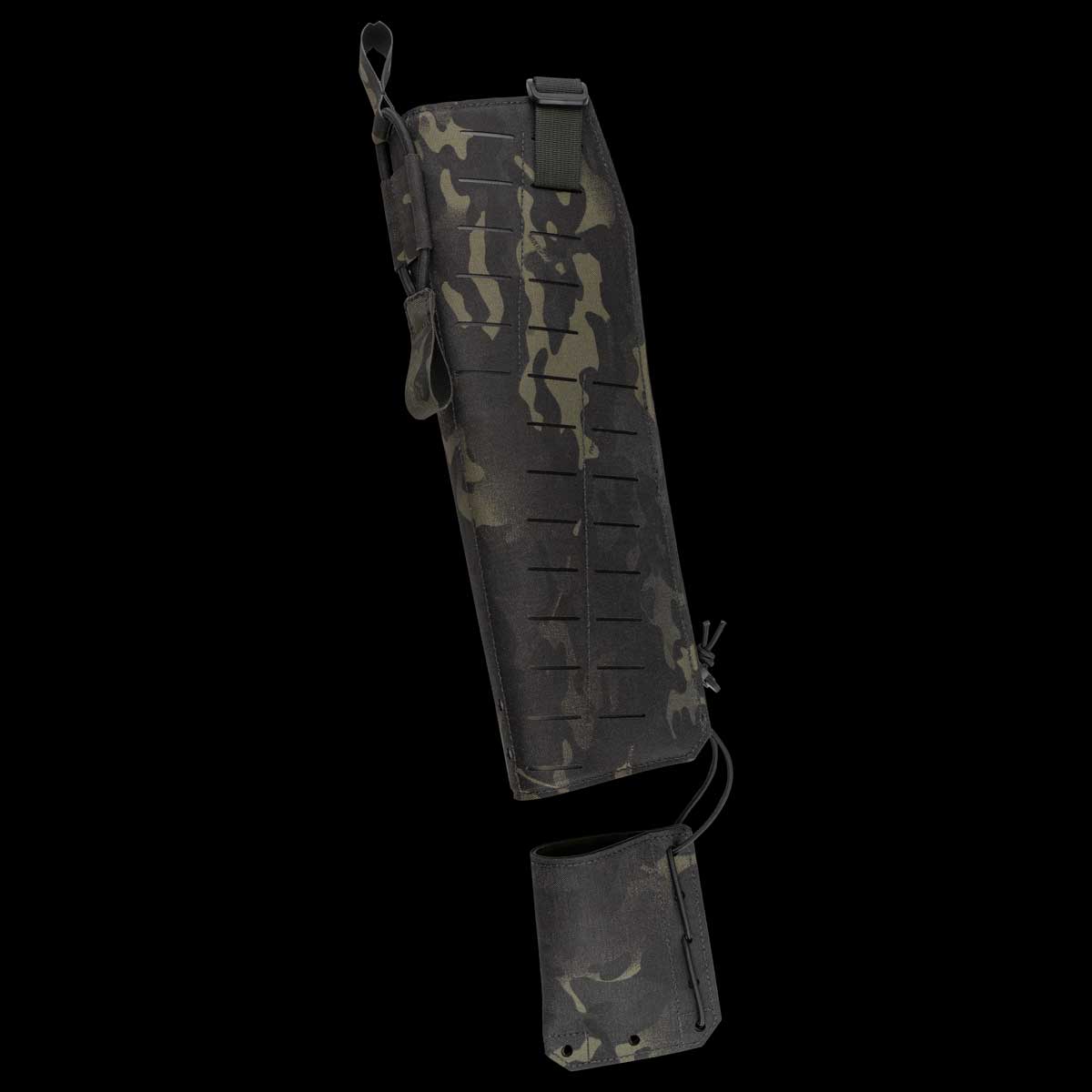 The scabbard is built from structured HDPE and highly-durable laminated nylon. Featuring adjustable retention straps, heavy-duty shock cord for increased stability, muzzle cover, and comprehensive 10° offset rear laser-cut MOLLE for easy removal and replacement when worn on the vest.